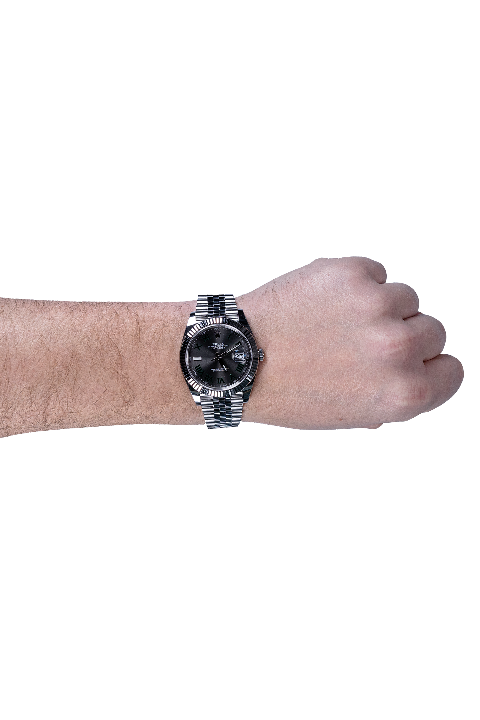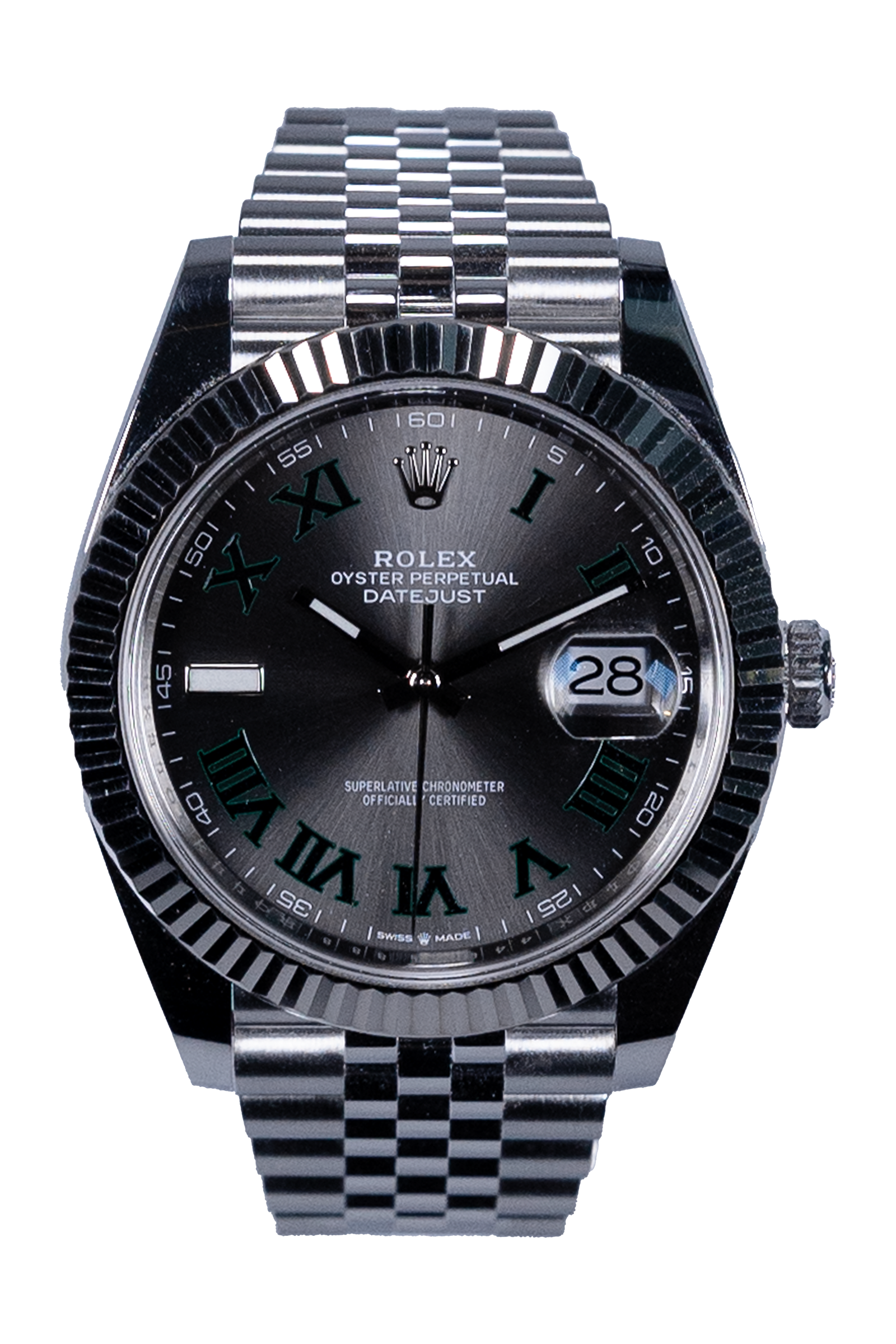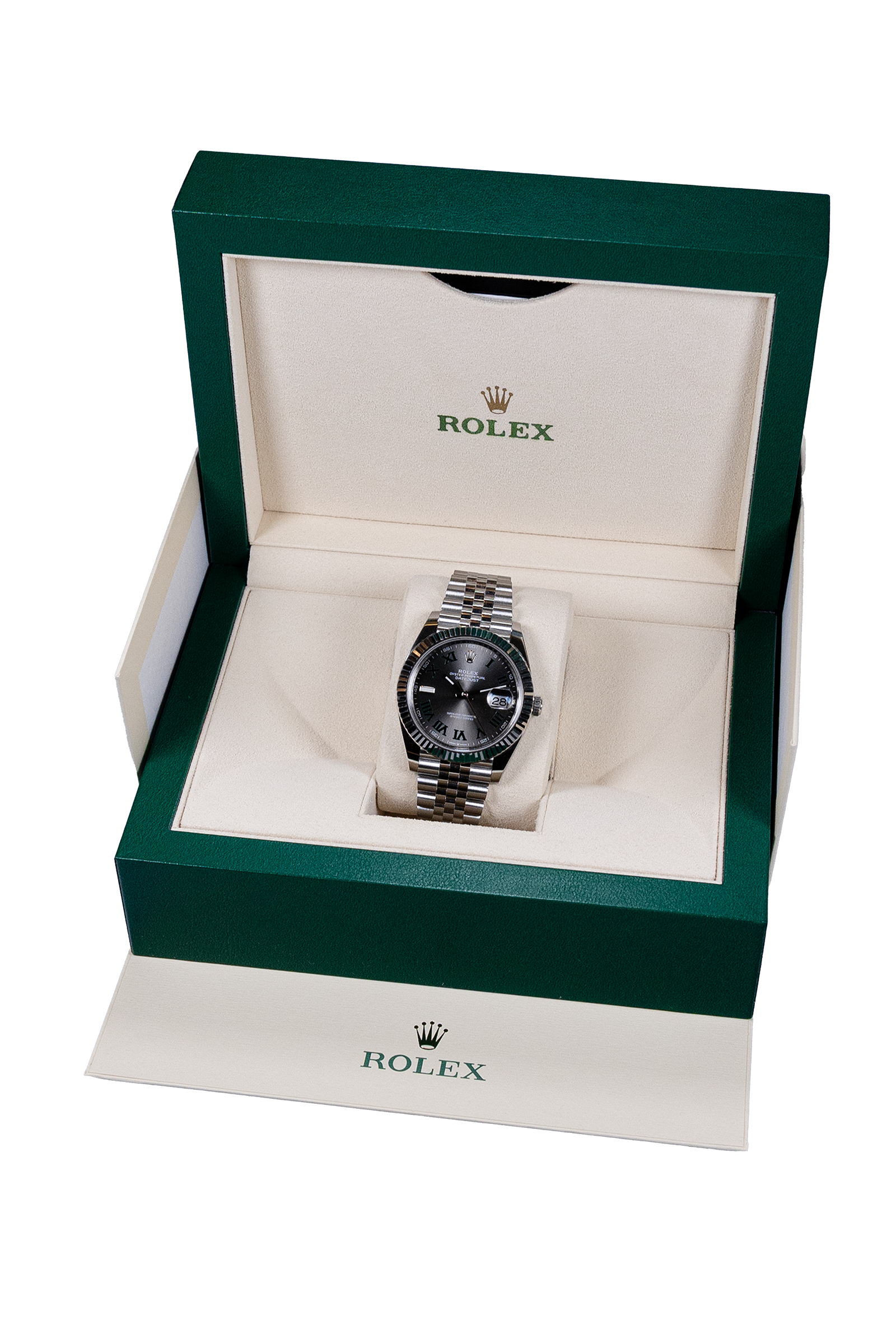 Diese Rolex Datejust 41 Ref. 126334 aus 2020 beeindruckt mit dem beliebten Wimbledon-Zifferblatt in Rhodiumgrau mit grünen römischen Ziffern. Die ikonische Weißgold-Lünette und das elegante Jubilee-Band verleihen der Uhr ihren charakteristischen Mix aus Sportlichkeit und Eleganz. Sie befindet sich in sehr gutem Zustand mit leichten Gebrauchsspuren und wird im kompletten Fullset, inklusive Originalbox und Papieren, geliefert – ein gefragter Klassiker mit markanter Ausstrahlung.