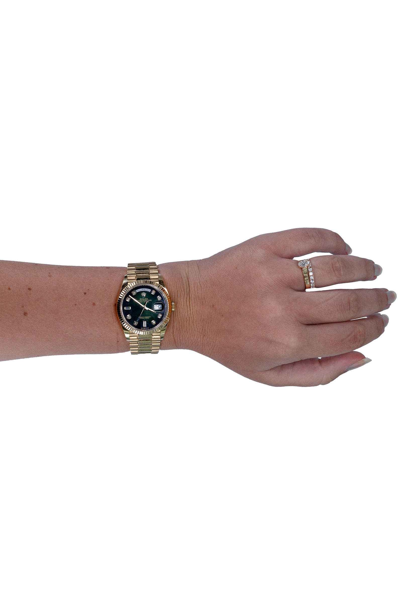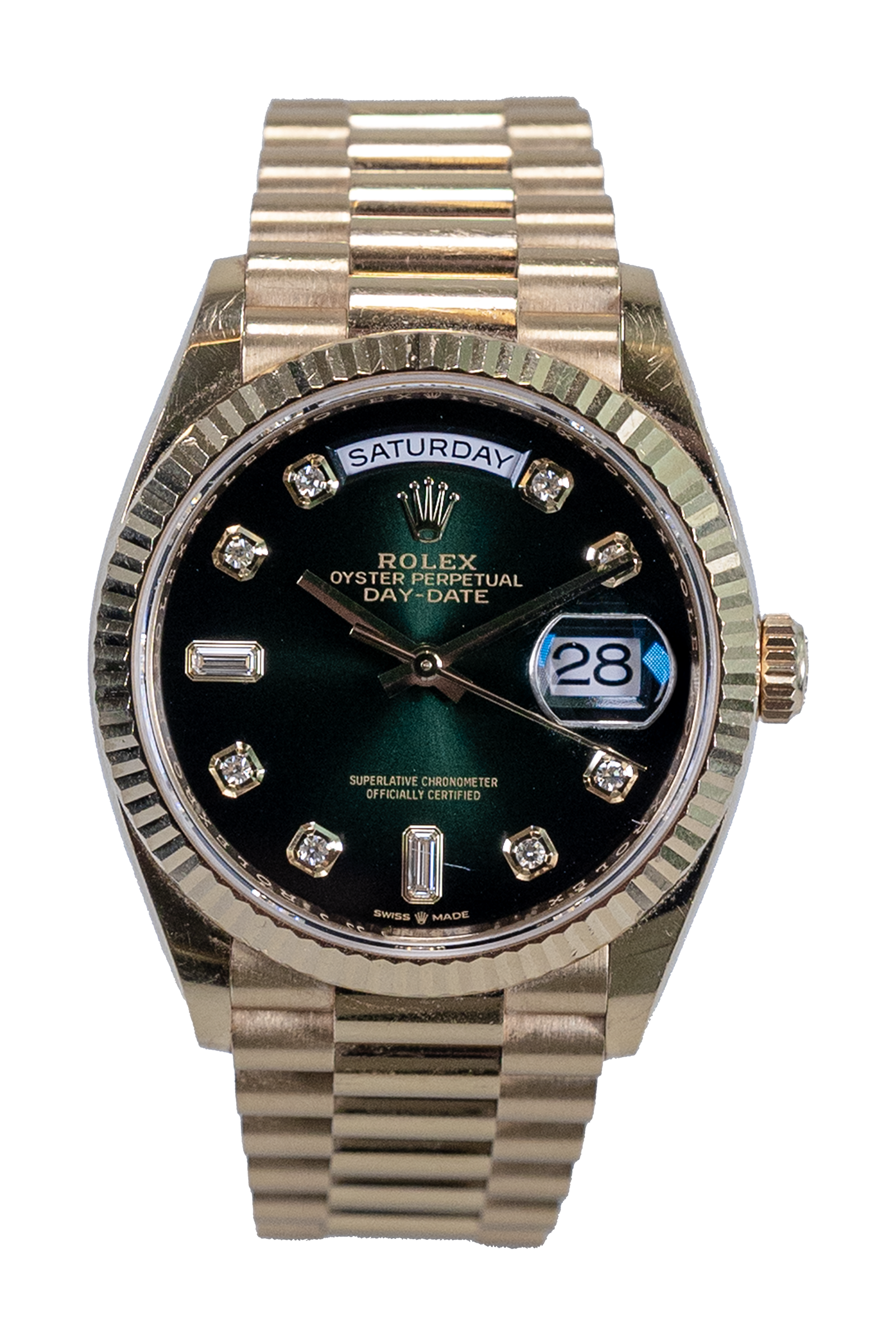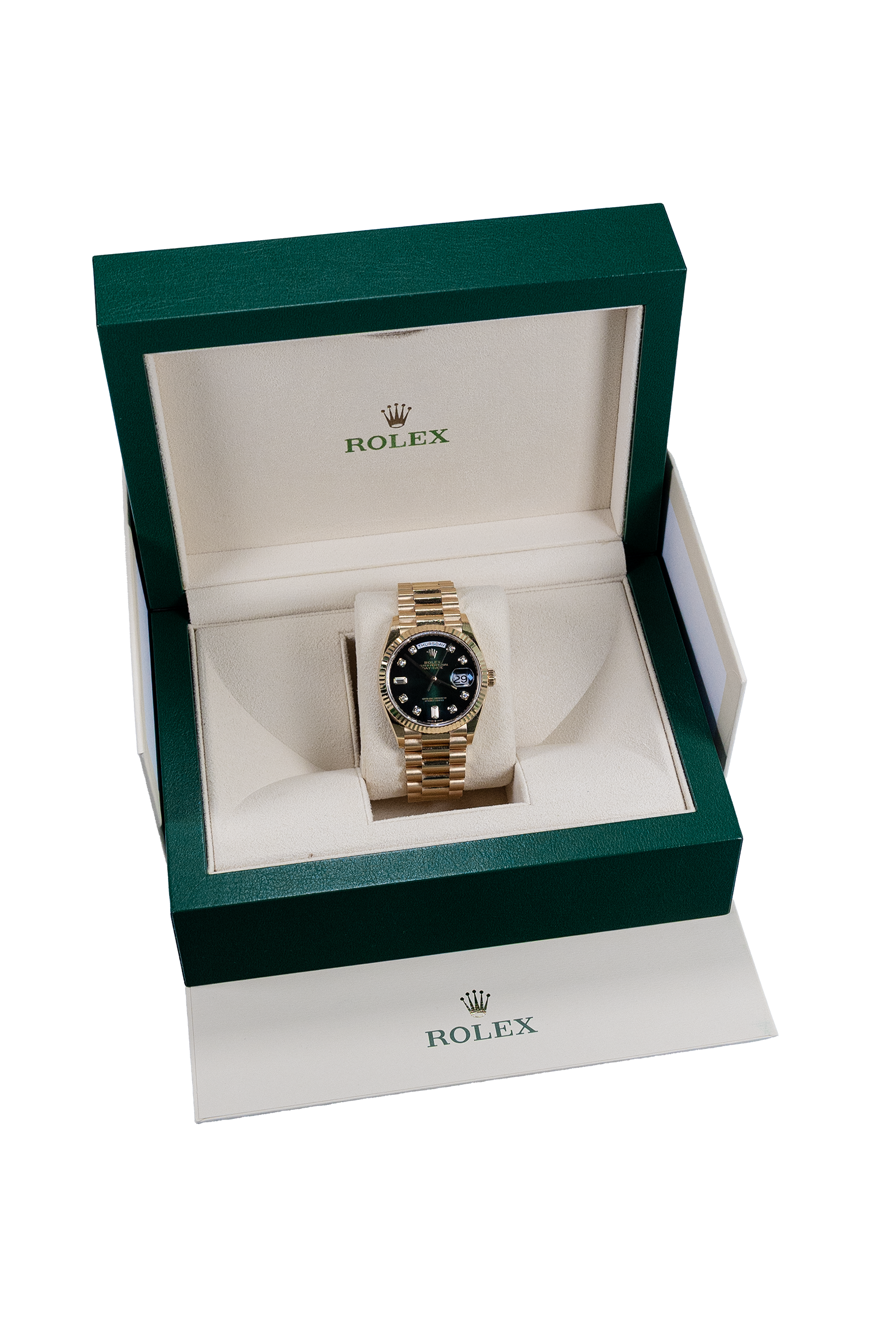Diese Rolex Day-Date 36 aus 2021 kombiniert edle Materialien mit ikonischem Design. Das 36 mm Gehäuse aus massivem Gelbgold strahlt pure Eleganz aus und wird durch das seltene grüne Ombre-Zifferblatt mit Diamantindizesbesonders hervorgehoben. Dieses Blatt verleiht der Uhr eine moderne, luxuriöse Optik mit hohem Wiedererkennungswert. Die Uhr weist leichte Gebrauchsspuren auf, befindet sich jedoch insgesamt in gutem Zustand. Geliefert wird sie im kompletten Fullset, inklusive Originalbox und Papieren. Ein außergewöhnlicher Klassiker der Day-Date-Kollektion mit markantem Auftritt.