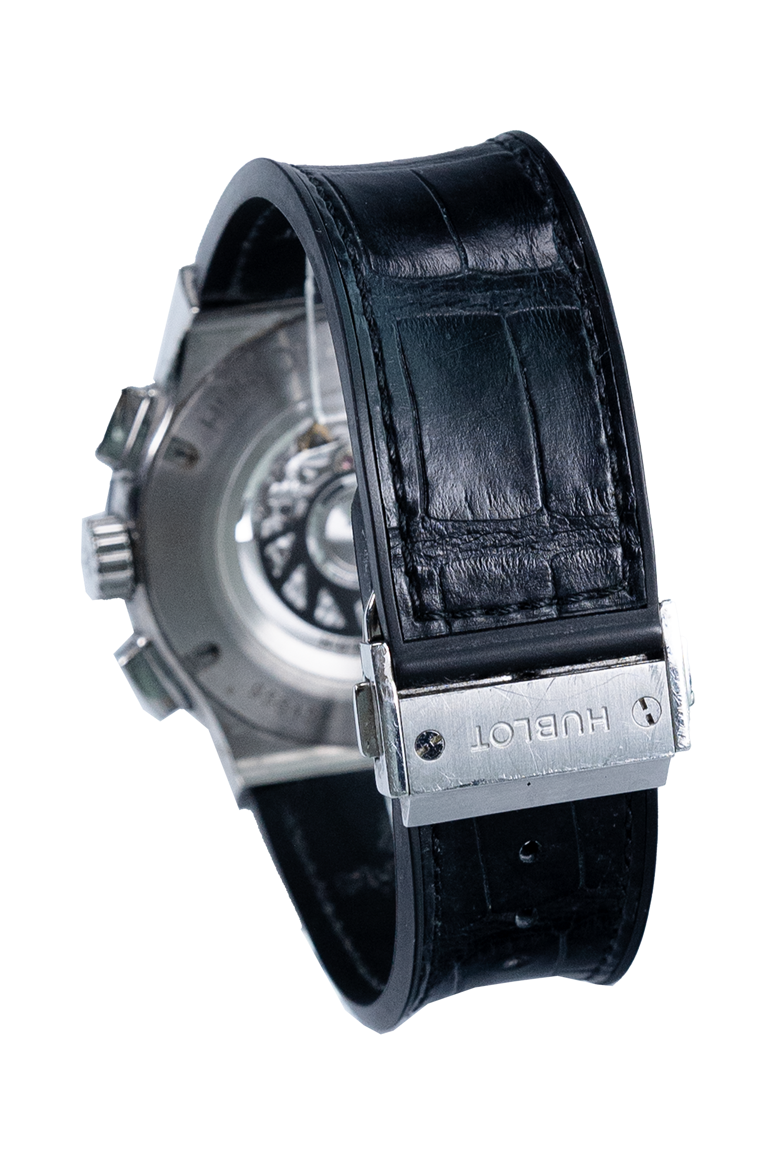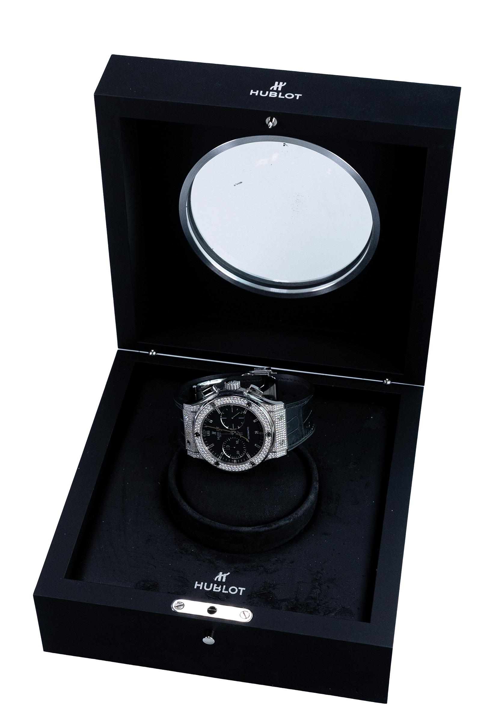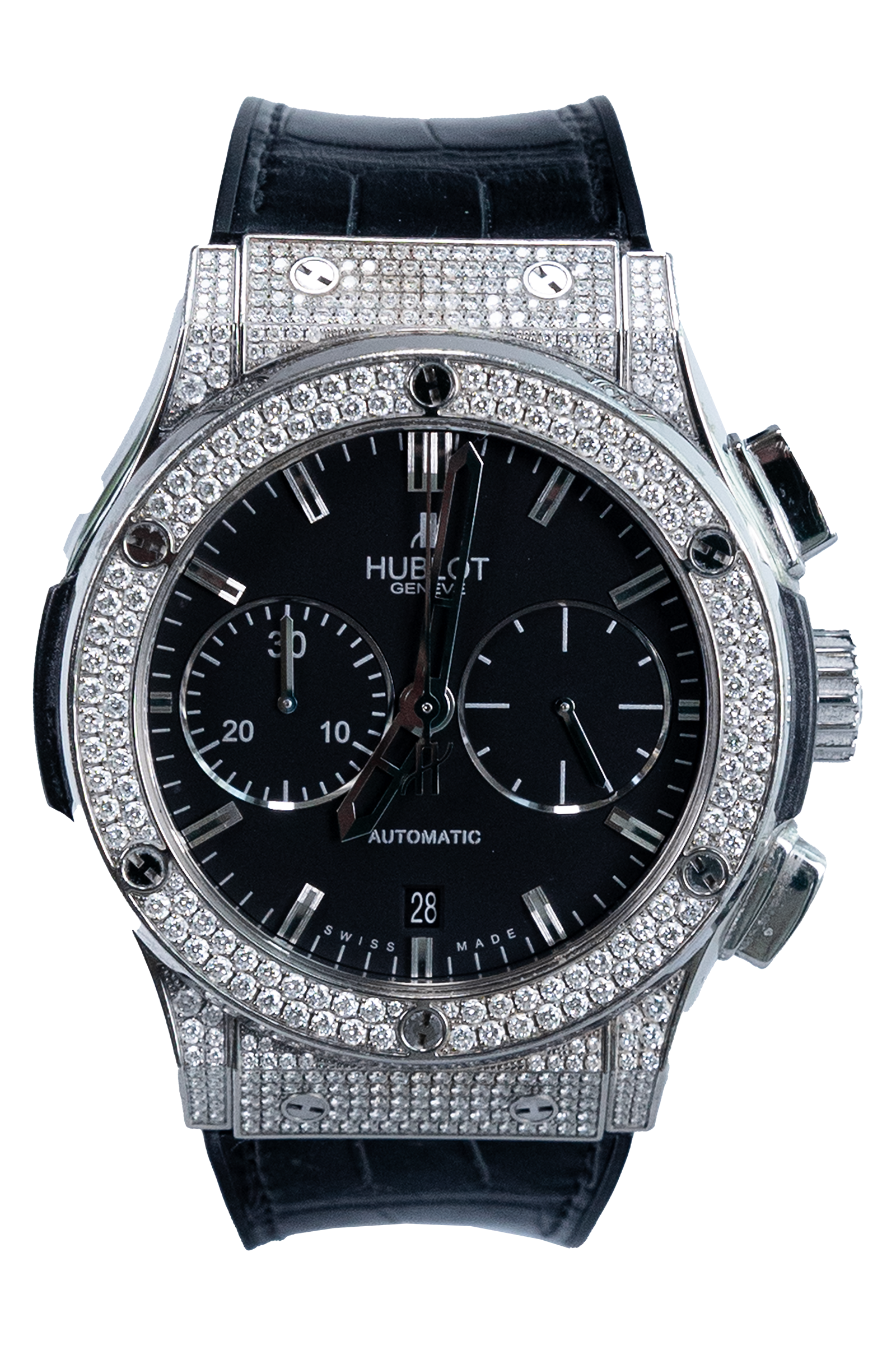 Ein Statement aus Titan und Brillanz: Diese Classic Fusion Chronograph begeistert mit einer von Hublot gesetzten Pavé-Diamantlünette und -Gehäuse – insgesamt 370 Diamanten, die ein luxuriöses Funkeln erzeugen. Das schwarze Zifferblatt und das schwarze Alligatorlederband setzen dazu einen kraftvollen Kontrast. 45 mm Gehäusedurchmesser, sportlich-eleganter Chronograph, im sehr guten Zustand und komplett im Fullset – ein Blickfang am Handgelenk.