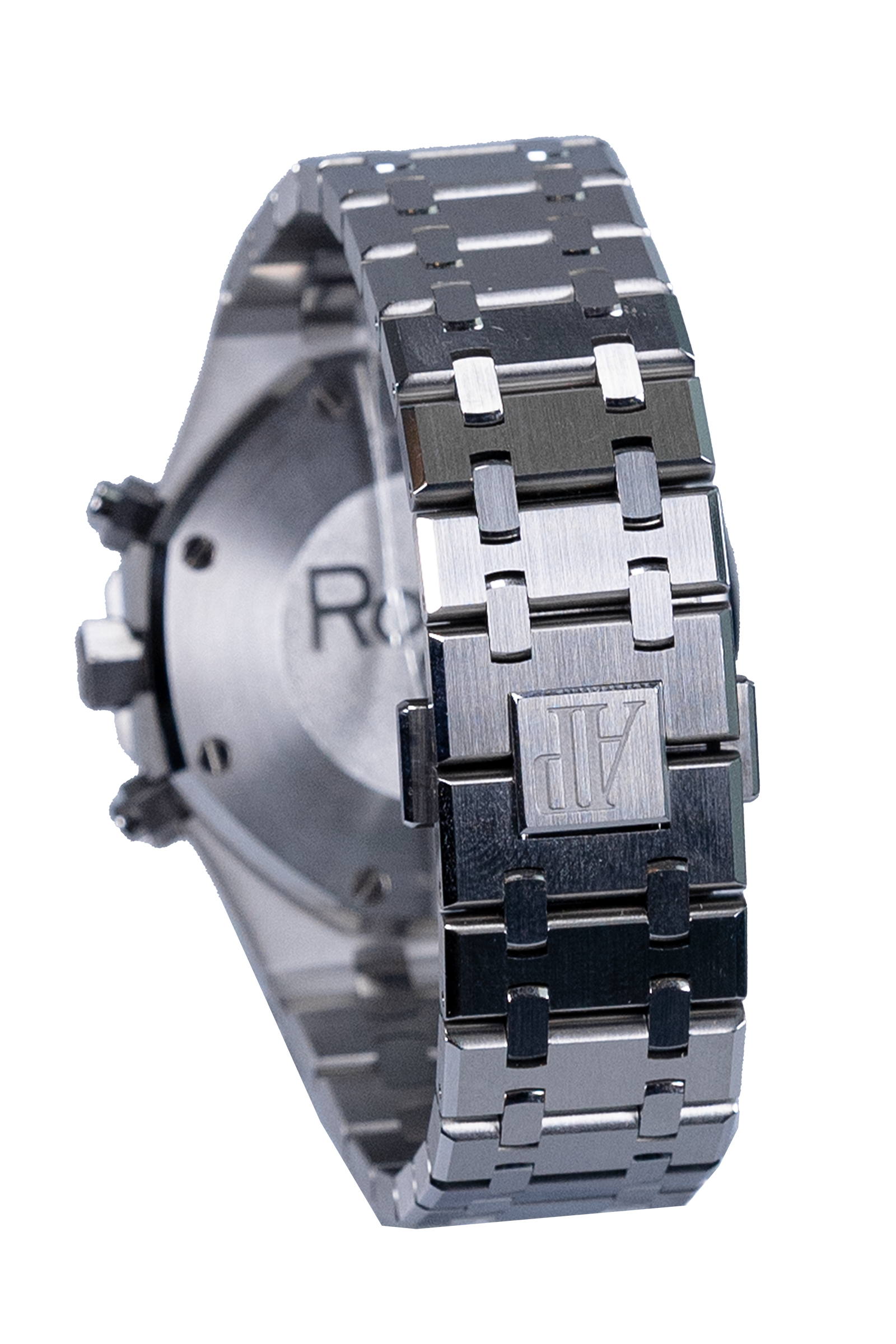 Diese Royal Oak Chronograph 26240ST aus 2020 präsentiert das ikonische Design von Audemars Piguet in seiner modernen Chronographen-Interpretation. Das 41-mm Edelstahlgehäuse, das integrierte Stahlband und das schwarze „Grande Tapisserie“-Zifferblatt verleihen ihr eine markante, sportlich-elegante Ausstrahlung. Ausgestattet mit dem neuesten AP-Chronographenwerk, ist dieses Modell technisch wie optisch ein Highlight der Royal Oak-Kollektion.