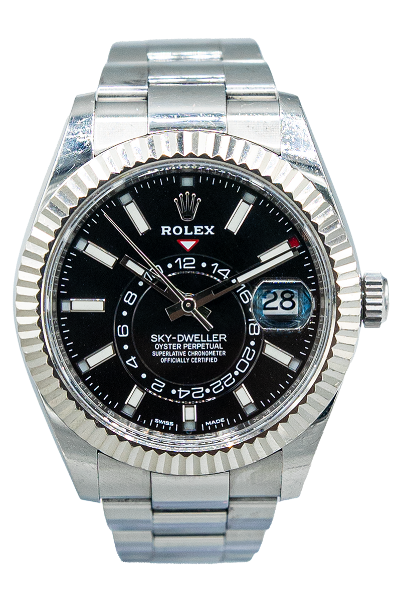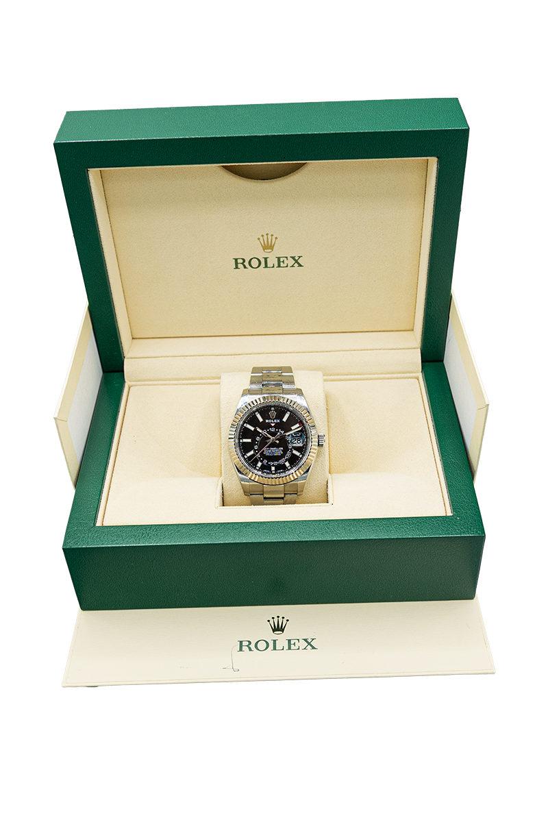 Die Rolex Sky-Dweller 326933 aus dem Jahr 2017 ist die perfekte Kombination aus technischer Raffinesse und klassischem Stil. Ausgestattet mit einem 42mm Gehäuse aus Edelstahl und Gelbgold, einem eleganten schwarzen Zifferblatt sowie der typischen geriffelten Lünette, bietet sie nicht nur eine starke Optik, sondern auch praktische Funktionen wie eine zweite Zeitzone und Jahreskalender. Die Uhr befindet sich in gebrauchtem, gutem Zustand und wird im Fullset, inklusive Originalbox und Papiere, geliefert. Jede Uhr wird von uns sorgfältig auf Echtheit geprüft und mit einem Zertifikat versehen.