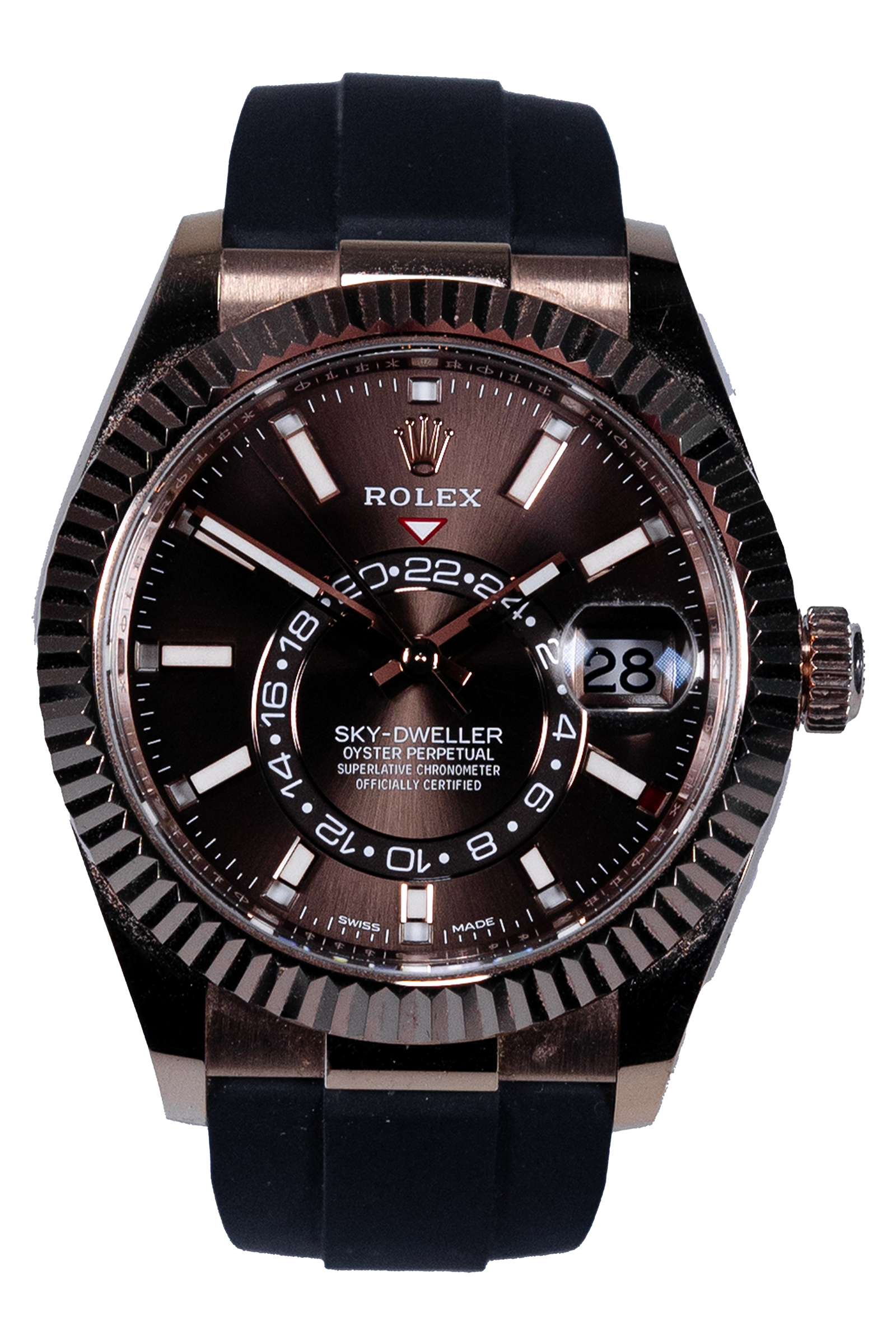 Diese Rolex Sky-Dweller Ref. 326235 aus 2022 vereint technische Raffinesse mit luxuriöser Ästhetik. Das Roségold-Gehäuse, das braune Zifferblatt und das elegante Oyster-Band verleihen der Uhr eine markante, warme Ausstrahlung. Als eine der komplexesten Rolex-Modelle bietet sie die Jahreskalender- und Dual-Time-Funktion – perfekt für Vielreisende. Die Uhr befindet sich in sehr gutem Zustand und wird im kompletten Fullset mit Box und Papieren geliefert.